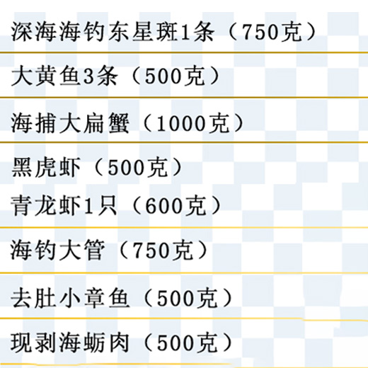 現(xiàn)捕現(xiàn)撈現(xiàn)發(fā),訂單確認(rèn)后,預(yù)計(jì)3個(gè)工作日到達(dá)。(江浙滬包郵,其他地區(qū)快遞費(fèi)用另算。)內(nèi)含:深海海釣東星斑1條(約750克),大黃魚3條(約500克),海捕大扁蟹(約1000克),黑虎蝦(約500克),青龍蝦1只(約600克),海釣大管(約750克),去肚小章魚(約500克)現(xiàn)剝海蠣肉(約500克)。